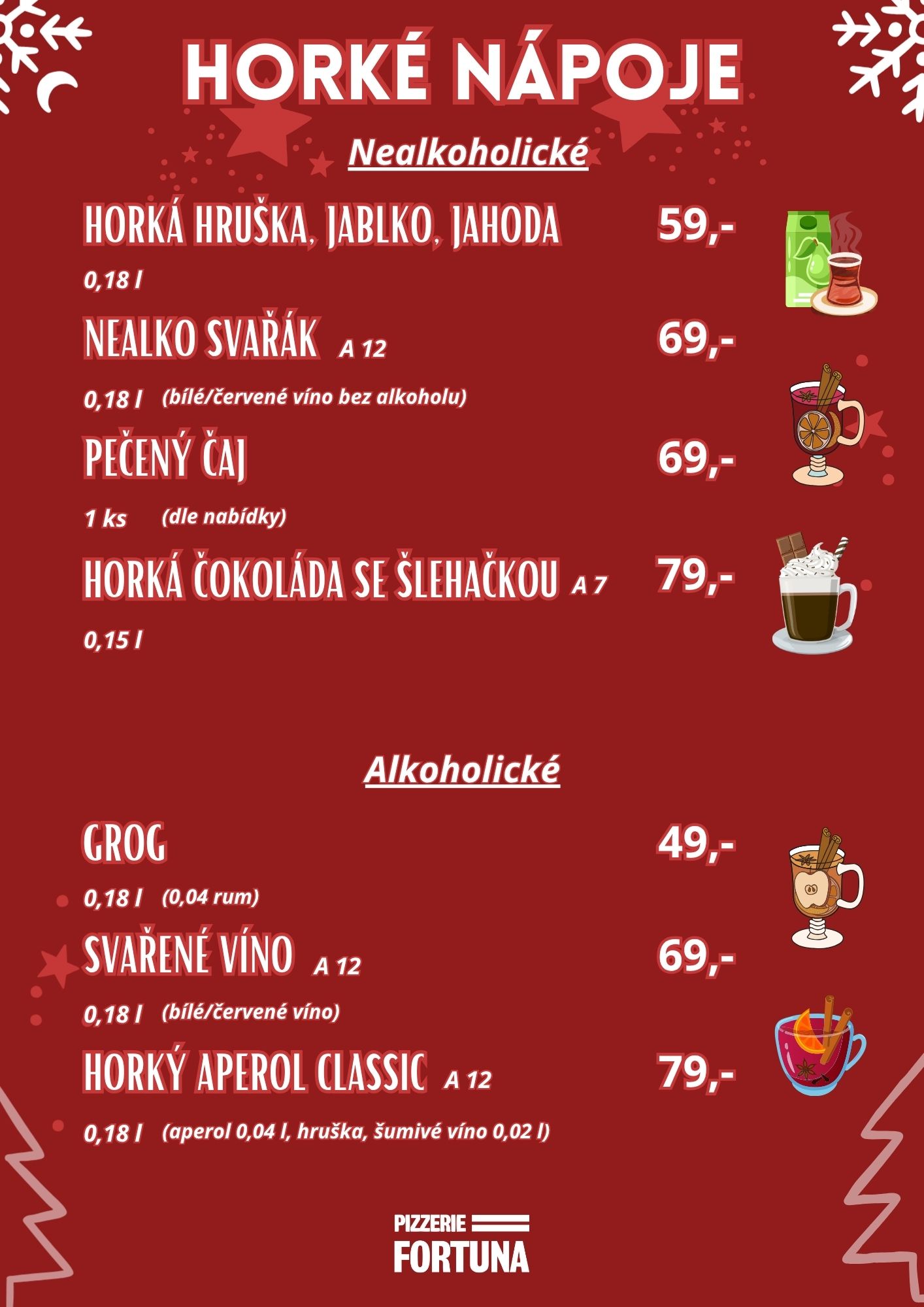 Zahřejte se u nás! V naší zimní nabídce najdete horkou čokoládu se šlehačkou, voňavý pečený čaj nebo tradiční grog a svařák. A pro milovníky originality máme horký Aperol Classic. Přijďte se ohřát a užít si tu pravou zimní atmosféru.